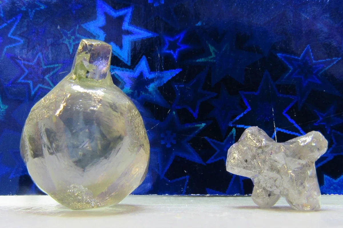 Форма одного из алмазов напоминает елочный шар. Драгоценный камень весит 17 карат. Вторая алмазная «игрушка» напоминает милого щенка и весит 2,7 карата.