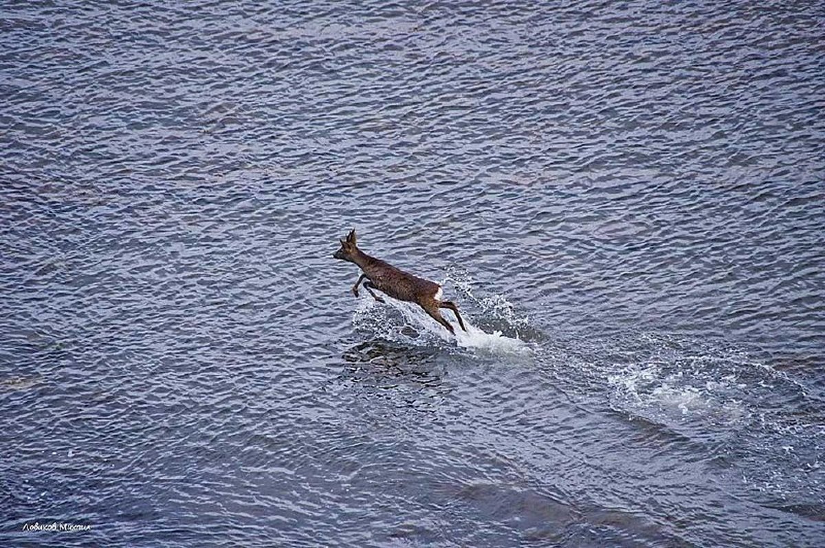 На фотографиях видно, как косуля бежит по мелководью вдоль берега, хотя на первый взгляд кажется, что животное находится в более глубокой воде.