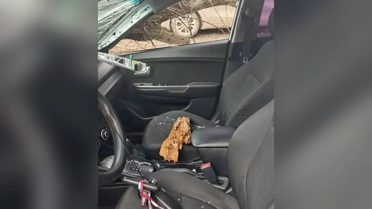 На кадрах с места происшествия видно, что дерево пробило одному из автомобилей лобовое стекло, погнуло металлическую балку. Также обломок дерева упал в салон.