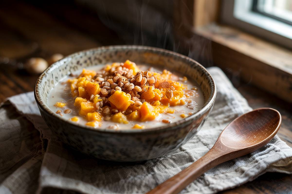 В этом блюде сошлись две различные традиции — китайская и мексиканская. Традиционная для Юго-Восточной Азии пшенная каша и культовое Южно-Американское тыквенное пюре. Сошлись, подружились и дали нам возможность оценить пользу мирного взаимопроникновения культур.