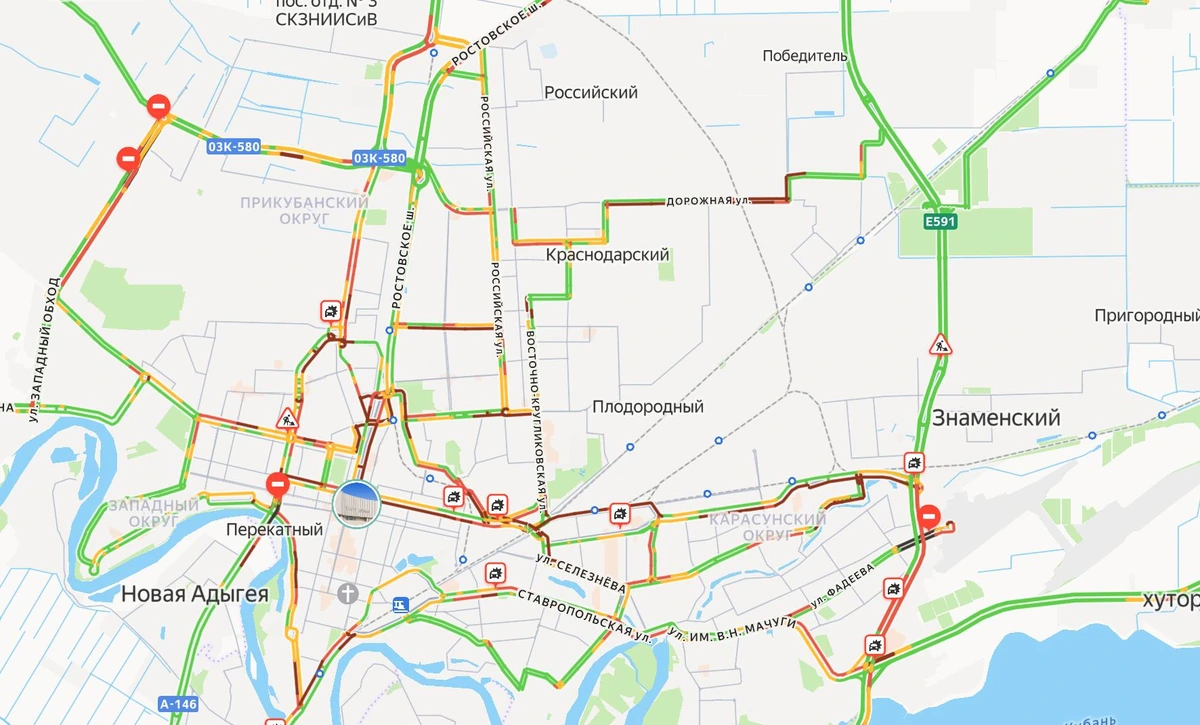 Самая сильная дорожная загруженность наблюдается в центре города. В бордовый окрасились улицы Красная, Гоголя, Октябрьская, Мира, Ленина, Коммунаров, Володи Головатого, Северная, Кубанская Набережная.