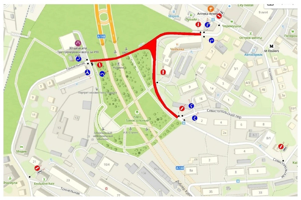 Движение транспорта ограничат на участках дорог, примыкающих к Завокзальному мемориальному комплексу — пересечении улицы Севастопольской с переулком Севастопольским и пересечении улицы Севастопольской с Тоннельной. Кроме того, перекроют проезд на придомовую территорию в районе дома №17 на улице Севастопольской.