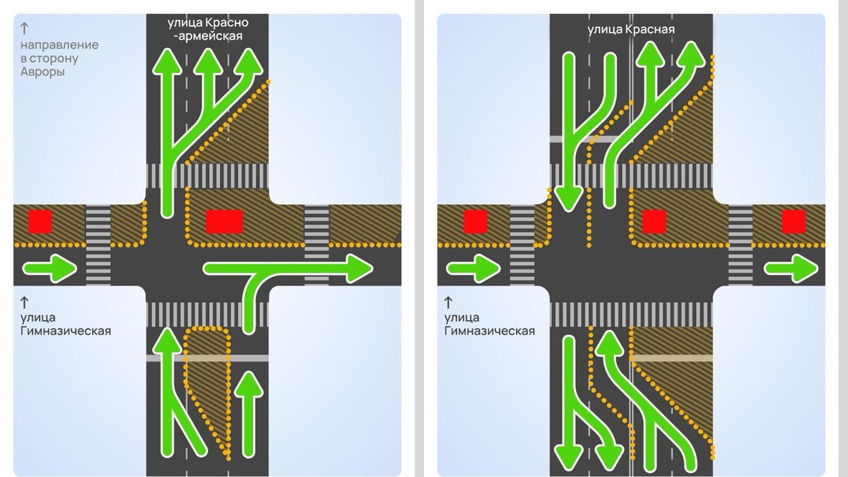 Место пересечения улиц Красноармейской и Гимназической сузят с трех до двух полос. При движении по улице Красноармейской в сторону улицы Северной крайняя левая полоса будет доступна для проезда прямо, центральную полосу перекроют, а крайняя правая полоса будет доступна только для поворота направо на улицу Гимназическую.