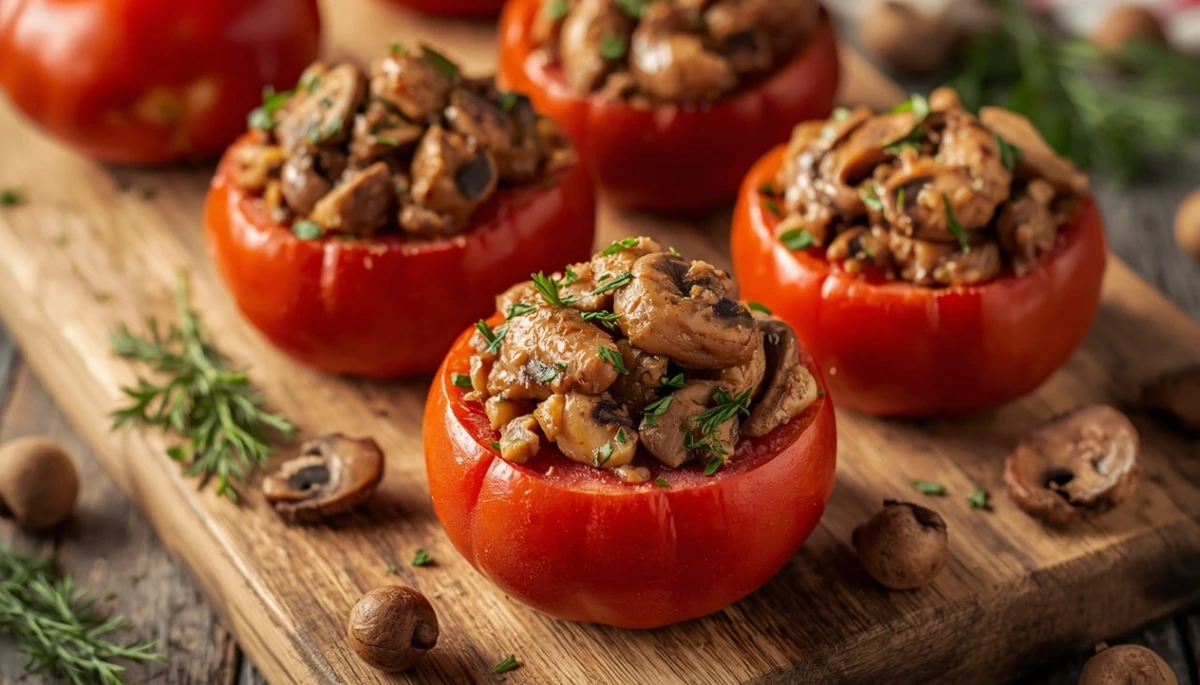 Кабачки, грибы дают сок. Поэтому если решаем их использовать — обжариваем их до полуготовности и даем жидкости выпариться. Иначе начинка «поплывет» и сделает стенки помидора водянистыми.