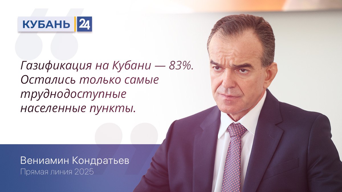 Глава региона отметил, что в 2025 году 1,3 млрд рублей выделили на газификацию в Краснодарском крае. И газификация на Кубани — 83%, остались только самые труднодоступные населенные пункты.