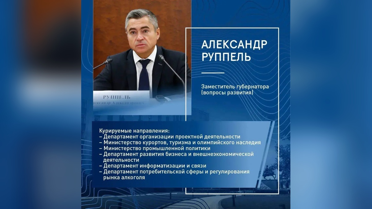 Вице-губернатором по вопросам промышленной политики, развития курортной отрасли, потребительской сферы, бизнеса и внешнеэкономической деятельности остается Александр Руппель. Он занимал этот пост с 2020 года, а ранее был министром экономики Краснодарского края.