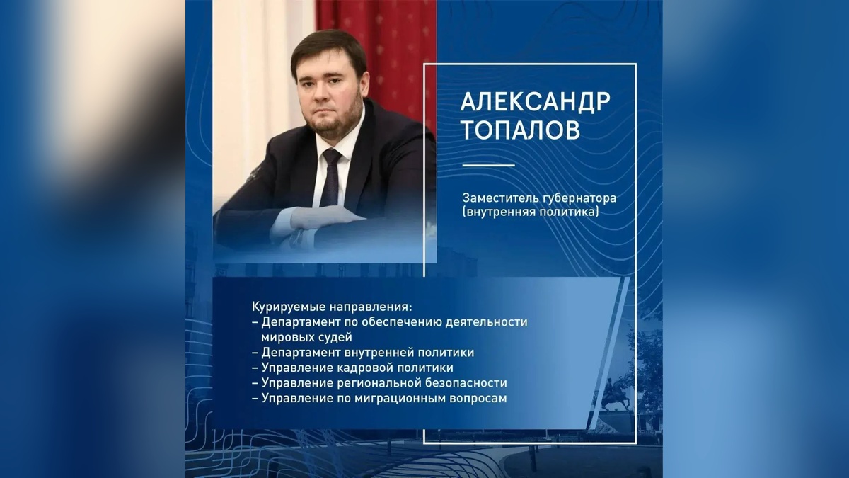 Заместителем губернатора по вопросам внутренней политики региона остается Александр Топалов. Данный пост он занимает с 2023 года. Ранее был директором департамента внутренней политики Краснодарского края.