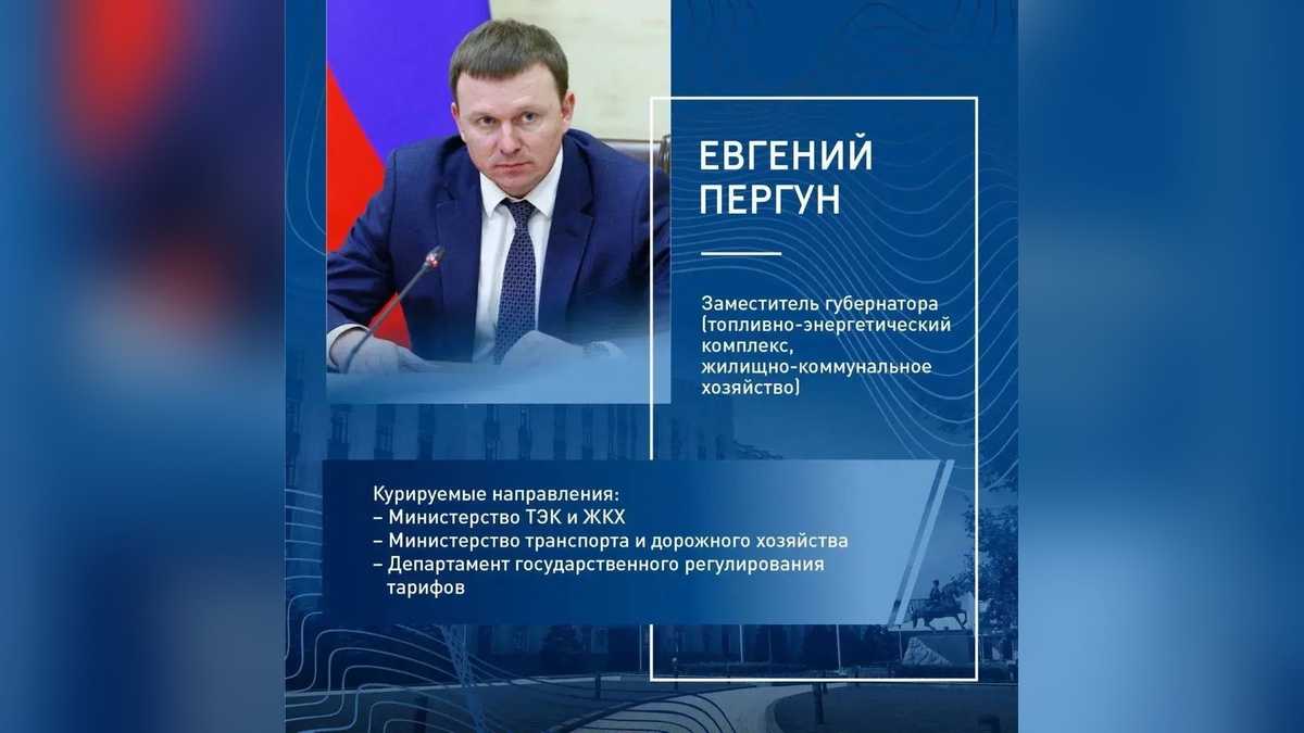 Евгений Пергун, назначенный вице-губернатором в 2024 году, продолжит отвечать за транспорт, ТЭК и ЖКХ, госрегулирование тарифов. С марта 2019 года по июнь 2024 года он был главой муниципального образования Динской район.