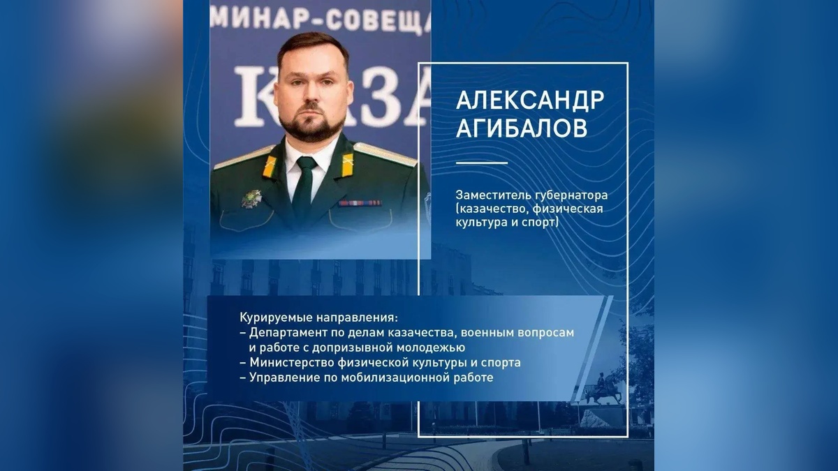 Вице-губернатором по вопросам казачества, спорта и мобилизационной работы назначен Александр Агибалов. Ему 37 лет, уроженец Краснодара. Окончил Кубанский государственный университет физической культуры, спорта и туризма. С 2011 года работал на различных должностях в учреждениях и органах исполнительной власти Краснодарского края, принимал участие в развитии системы образовании и молодежной политики, духовно нравственного и военно-патриотического воспитания, был председателем Союза казачьей молодежи Кубани. С 2020 года занимал руководящие должности в Сахалинской области, был советником губернатора Хабаровского края, атаманом Уссурийского казачьего войска. Участник специальной военной операции, сообщает пресс-служба администрации Краснодарского края.