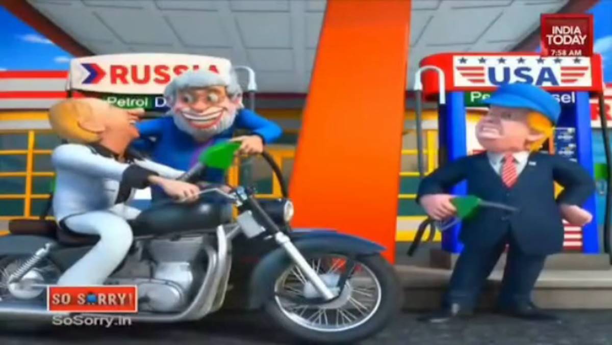 Также в ролике есть сцена на автозаправочной станции. Мультипликаторы изобразили две бензоколонки: одну с российской символикой, другую — с американской. Возле бензоколонки США нарисовали президента Дональда Трампа, который с недовольством наблюдает, как индийский премьер-министр заправляет мотоцикл российским топливом. Затем партнеры продолжают совместную поездку, оставив американского лидера не у дел.