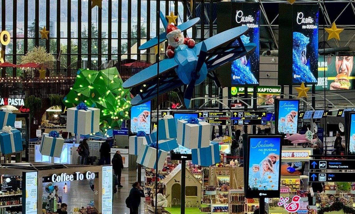Так в зоне предполетного досмотра, в секторе B2, появилась 25-метровая инсталляция, где Дед Мороз, летящий на самолете, везет елку. К самолету также прикреплены подарки и полумесяц со звездами. Кроме Деда Мороза-пилота в зоне досмотра разместили гирлянды. Их длина — 65 м.