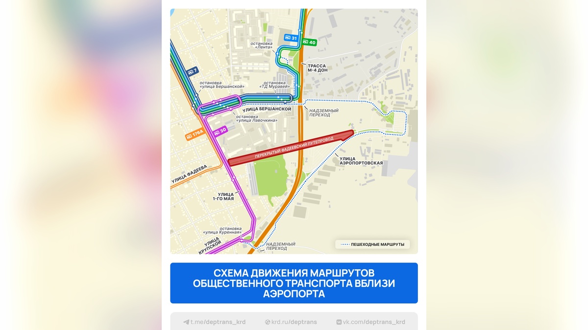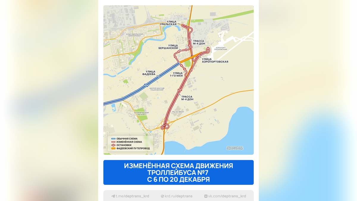 Также на время ремонта путепровода изменится схема движения троллейбусов по маршруту № 7. Транспорт будет поворачивать с Фадеева на 1-го Мая, затем выезжать на трассу М-4 «Дон», разворачиваться на развязке около ТРЦ «Oz Молл» и следовать по автомагистрали до поворота на Аэропортовскую. Обратный путь пройдет через Аэропортовскую с выездом на трассу до Уральской, где троллейбус развернется и через Бершанскую и 1-го Мая вернется к улице Фадеева. Дальнейший путь — без изменений.