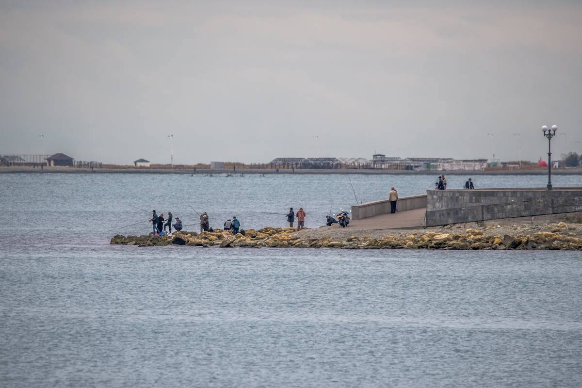 На опубликованных им фотографиях люди ловят рыбу на удочки с западного мола у морского вокзала. Рыбаки выстроились по всей длине узкой пристани — до самого маяка.