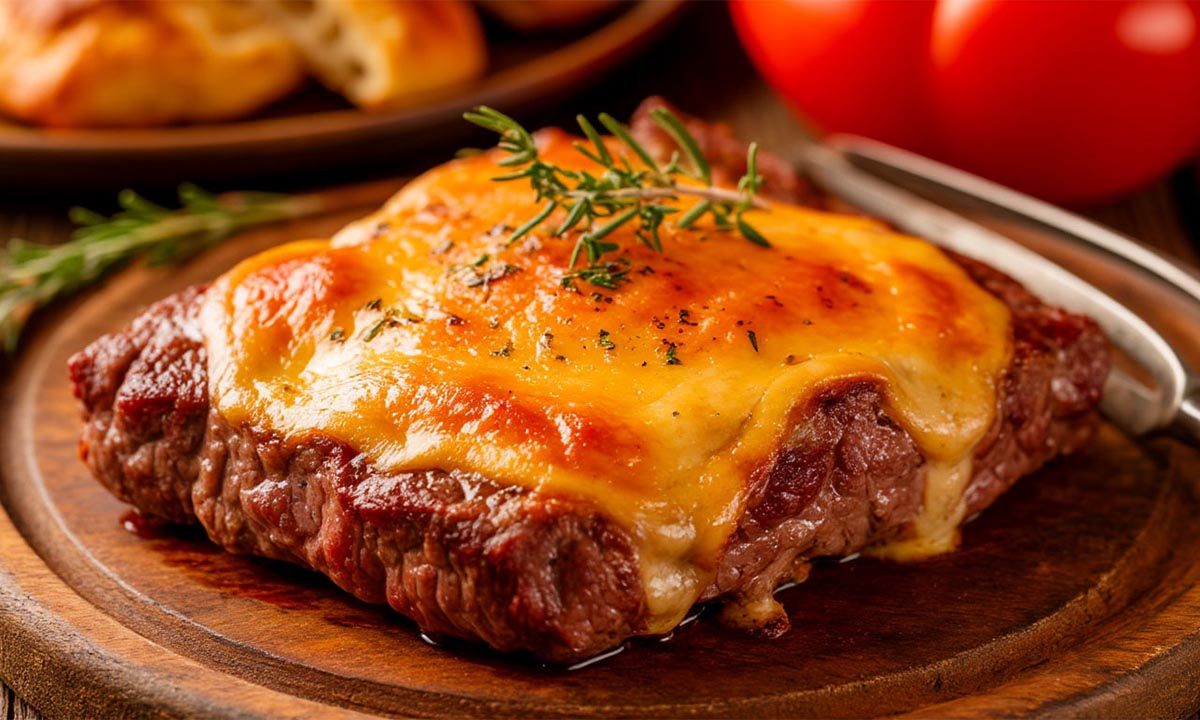 Еще один важный момент: ставим противень в уже разогретую духовку. Не в холодную. Иначе есть все шансы блюдо пересушить. Итак, духовка разогрета до 200 градусов, отправляем в нее противень с нашим «пирогом» и ждем 45-50 минут. Как только сырная корочка подрумянится и станет благородного светло-коричневого цвета с золотым оттенками — мясо готово.