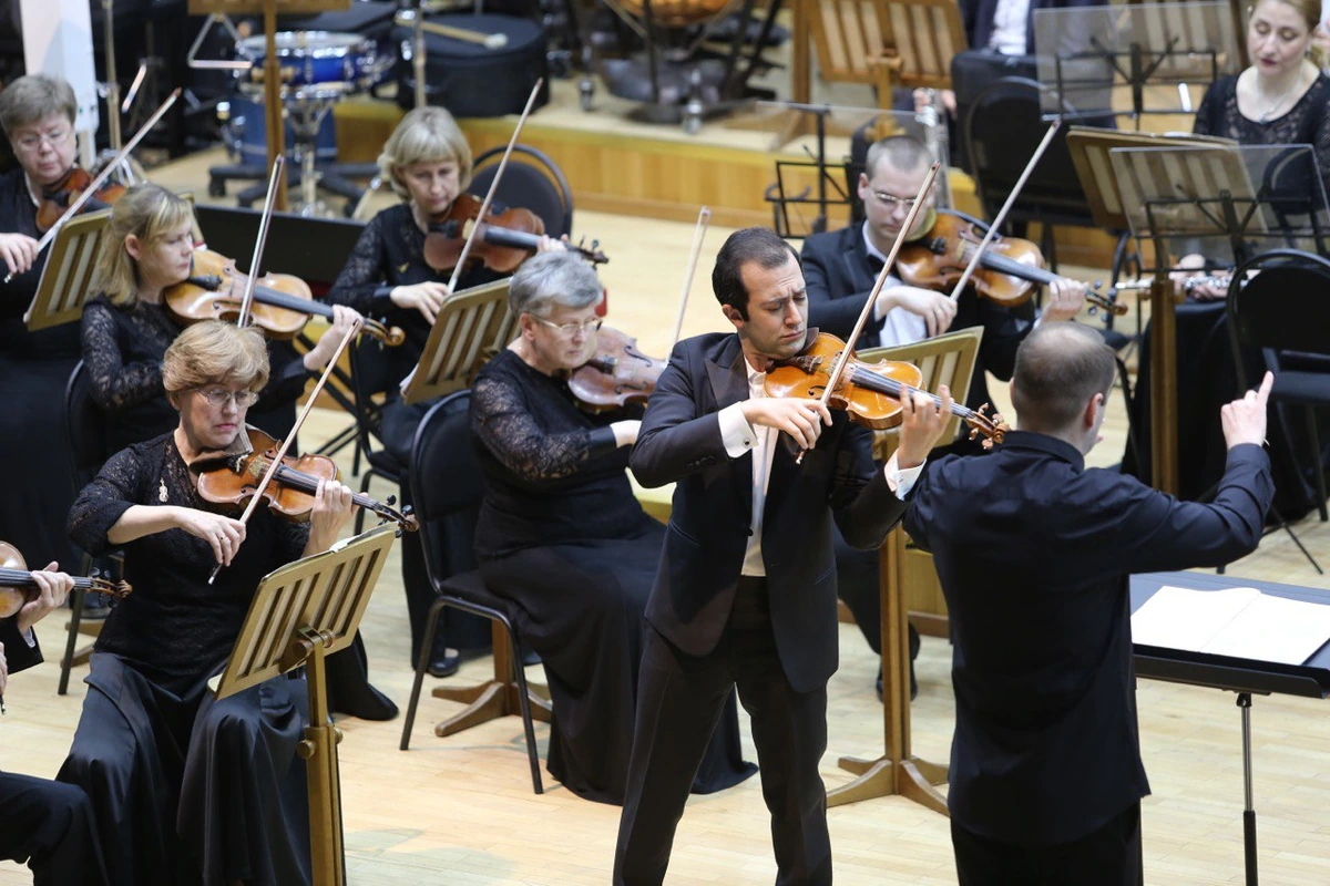 За дирижерским пультом — Денис Ивенский, солист — скрипач Гайк Казазян.