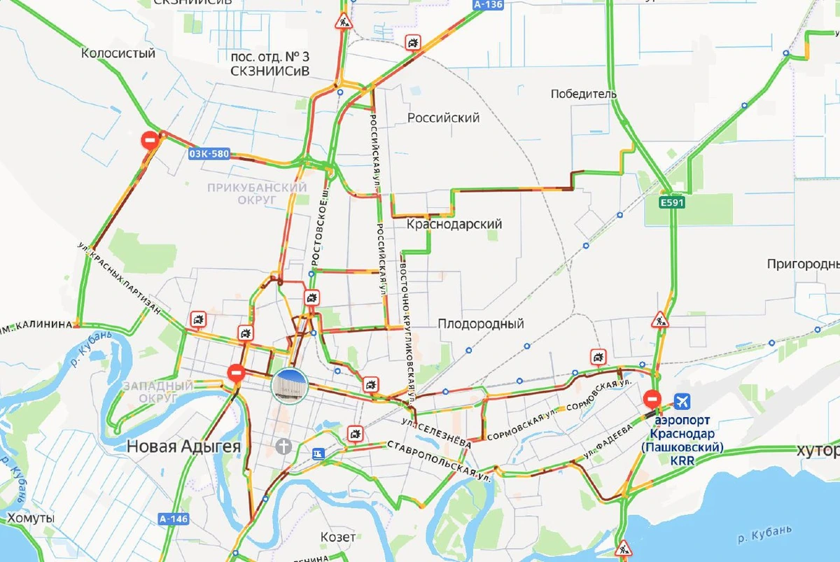 На выезде из Краснодара стоит улица Западный обход. Пробки наблюдаются и на Восточном обходе — на Уральской и Аэропортовской.