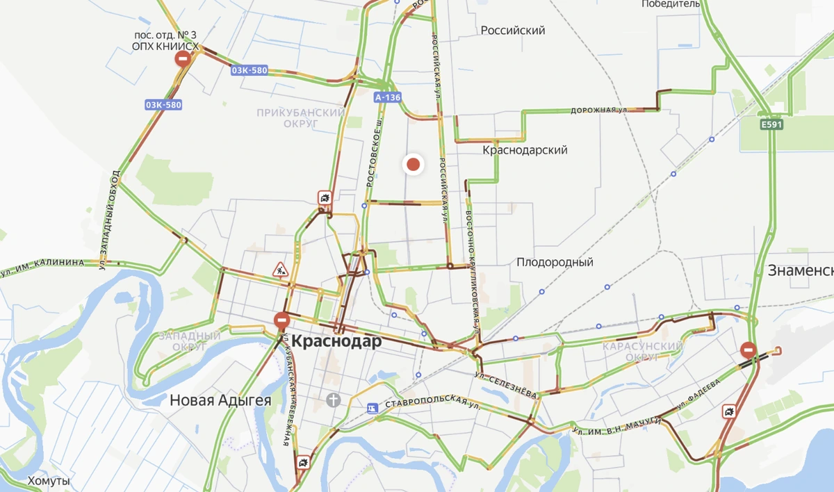 По данным на 18:45, пробки образовались на улицах Красной, Северной, Советской, Промышленной, Буденного, Кузнечной, Рашпилевской, Суворова, Кубанской Набережной, Захарова.