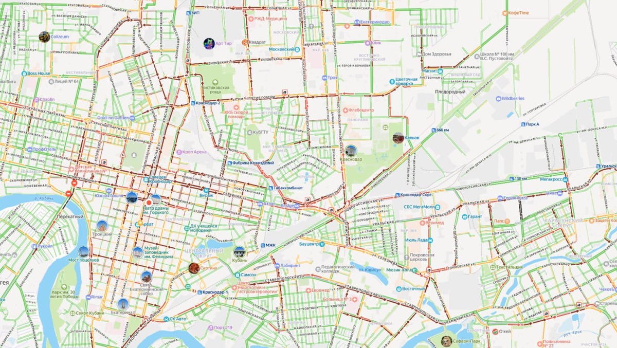 В центре Краснодара в бордовый цвет на картах окрасились улицы Северная, Филатова, Передовая, Промышленная, Володи Головатого, Кузнечная, Буденного, Красная, Тургенева, Рашпилевская, Калинина, Гоголя, Кубанская Набережная, Красноармейская и другие.