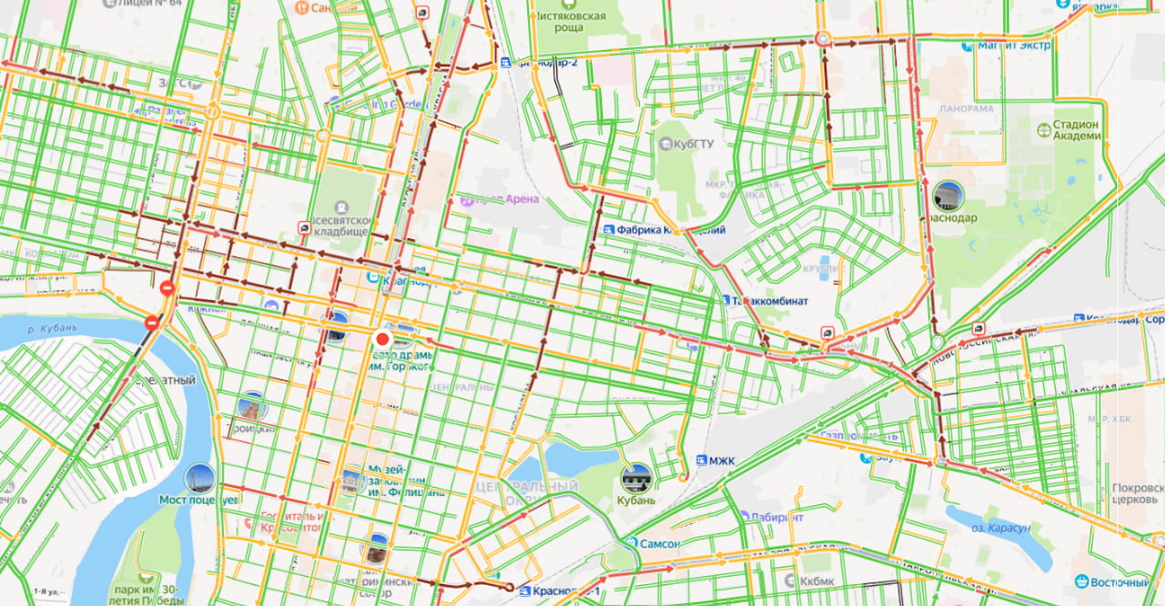 По данным на 18:40, водители встали в пробках в центре города — на улицах Мира, Суворова, Буденного, Калинина, Северной, Красной, Хакурате, Володи Головатого, Тургенева, Красных Партизан и других.