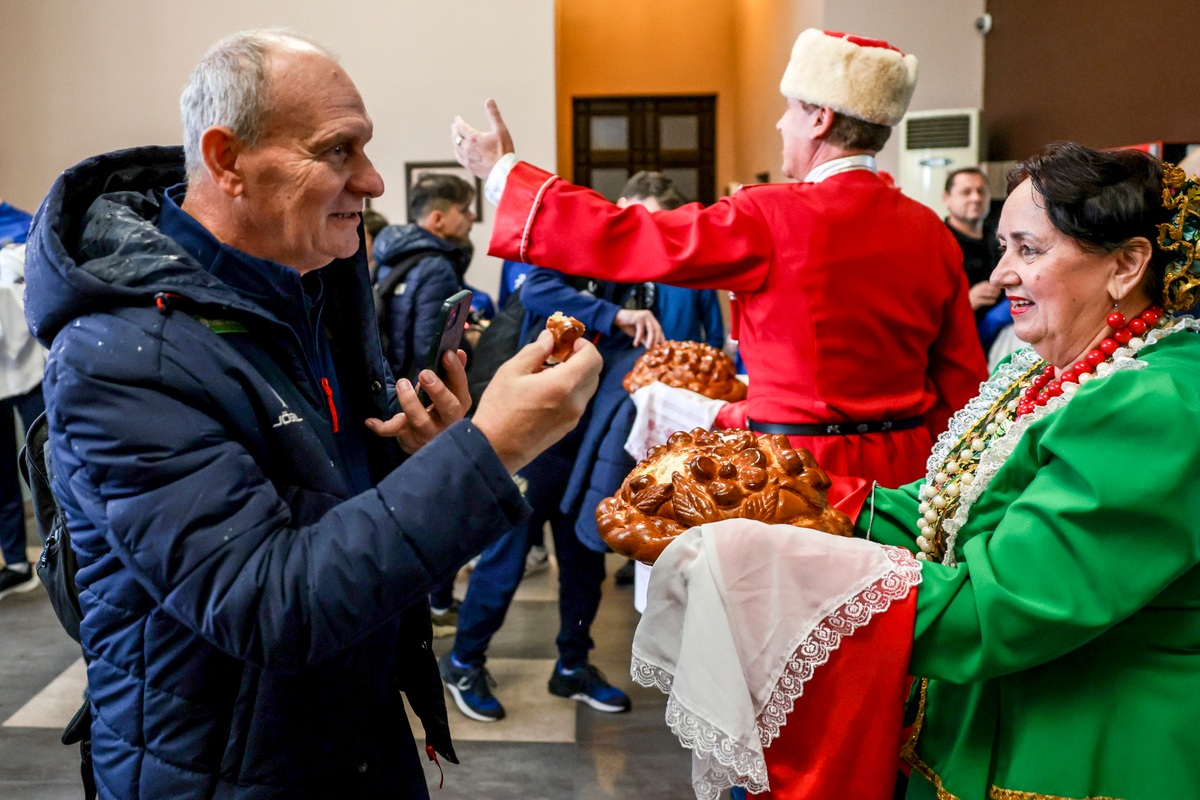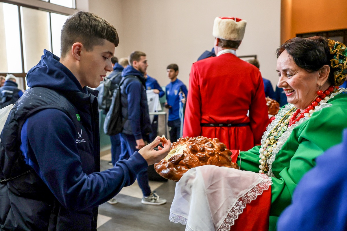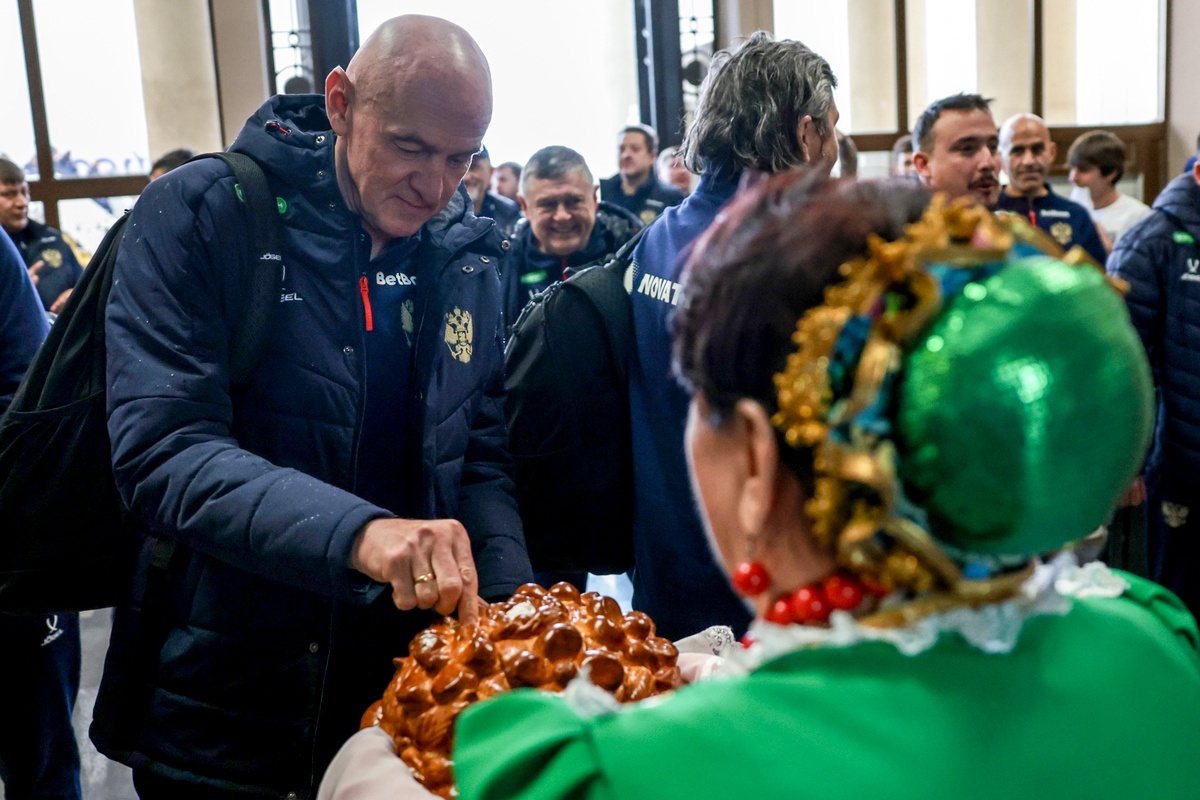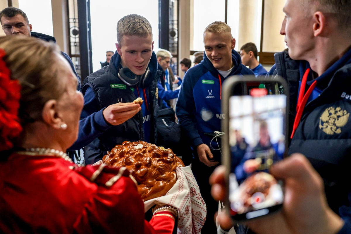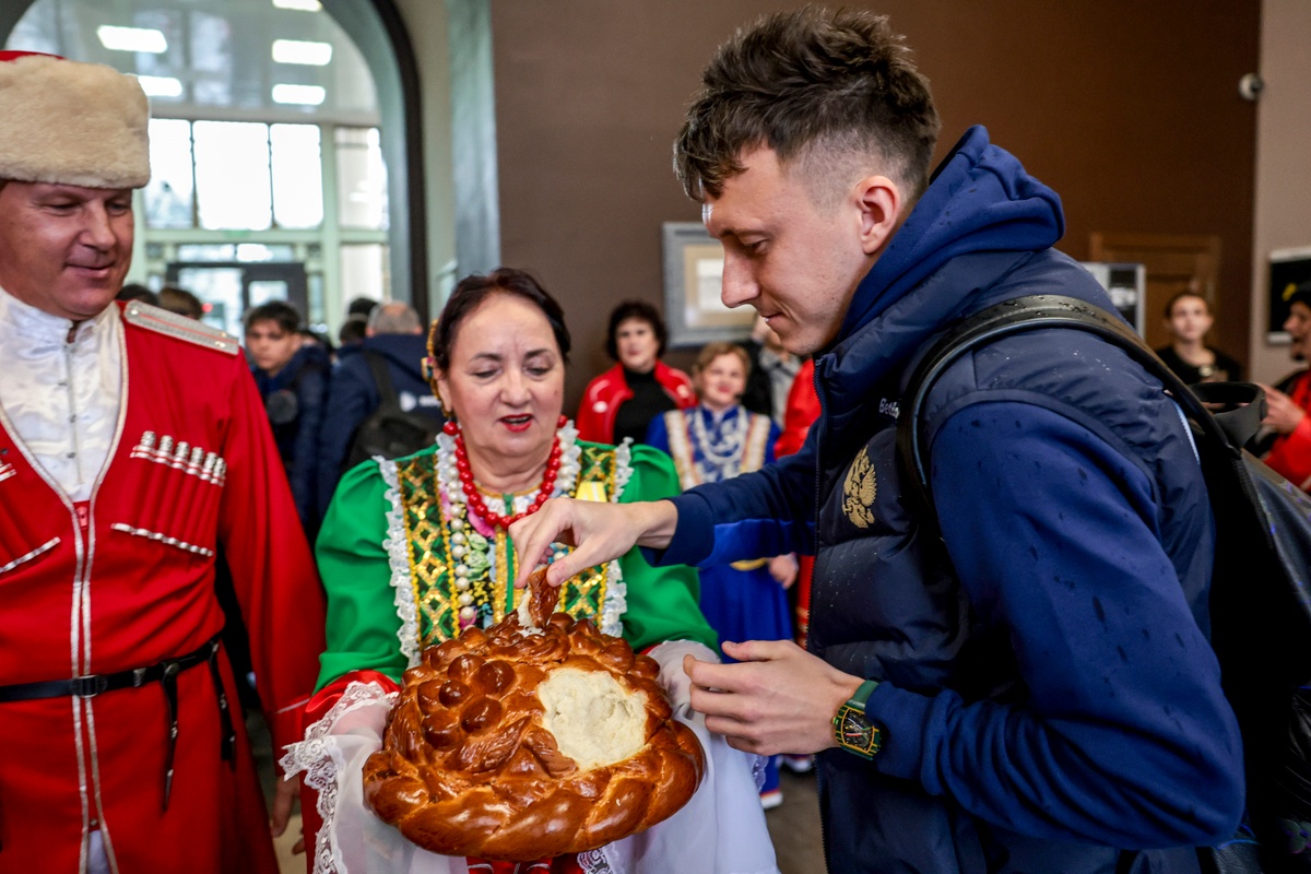 Сборная России уже прибыла в Сочи. По традиции их с песнями встретили казаки в традиционных костюмах, угостили хлебом и солью.