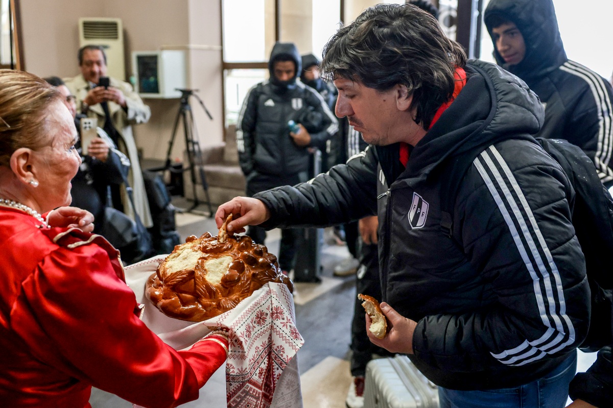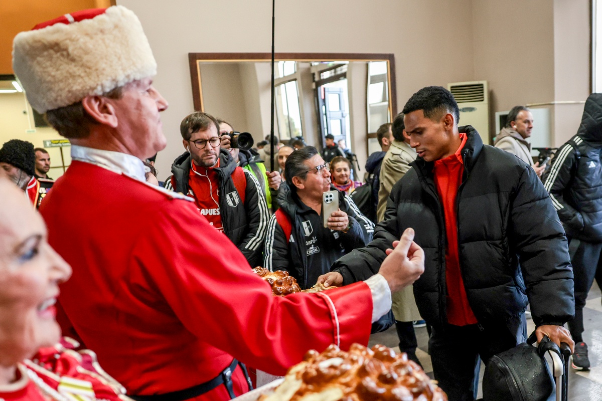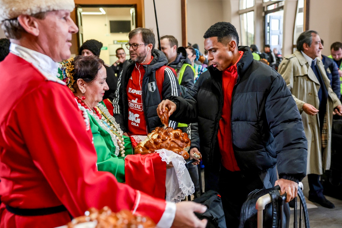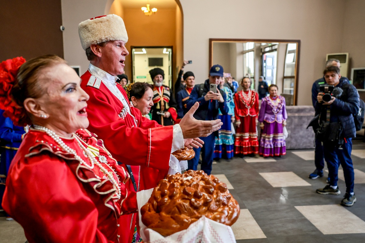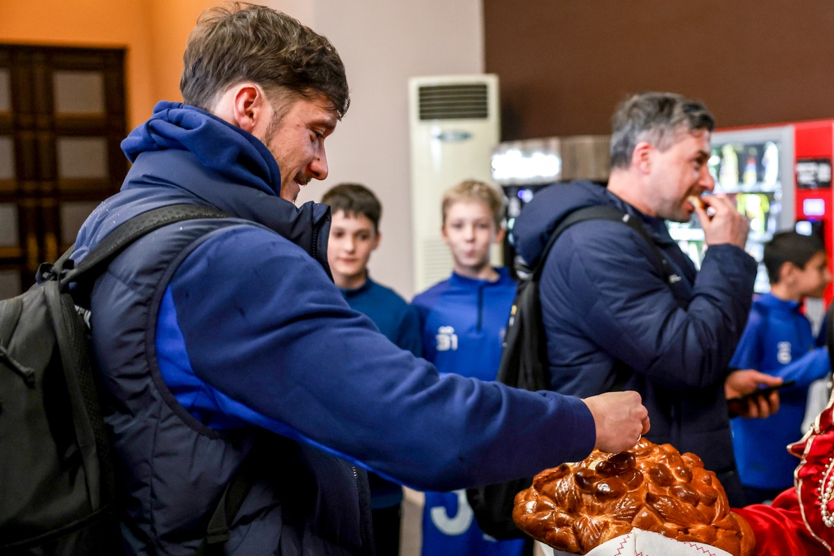 Сборная России уже прибыла в Сочи. По традиции их с песнями встретили казаки в традиционных костюмах, угостили хлебом и солью.