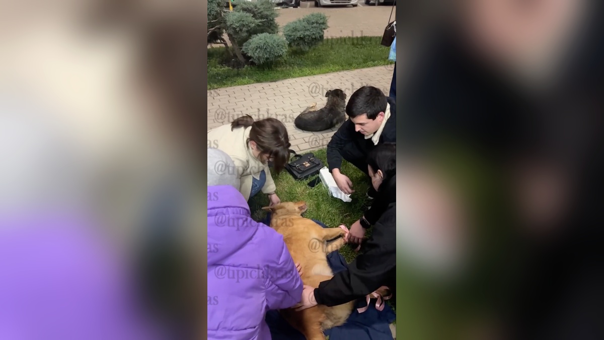 На опубликованных кадрах видно, как собака лежит на газоне и бьется в конвульсиях. Неравнодушные прохожие пытаются погрузить животное на импровизированные носилки, чтобы отвезти в ветклинику.