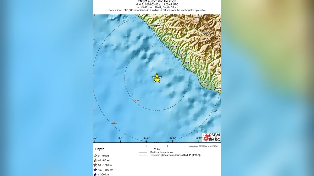 По информации Евро-Средиземноморского сейсмологического центра, эпицентр землетрясения находился в 29 км от Сочи и в 192 км от Краснодара на глубине 10 км в акватории Черного моря. Магнитуда сейсмособытия составила 4,8.