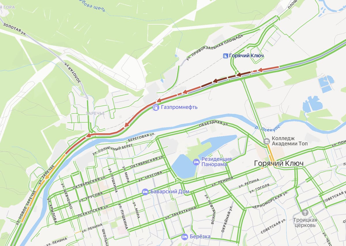Пробка на трассе М-4 «Дон» в Горячем Ключе начинается перед развязкой и тянется почти до здания Социального фонда. Красным окрашен участок до 1388 км, дальше пробка уже не такая плотная.
