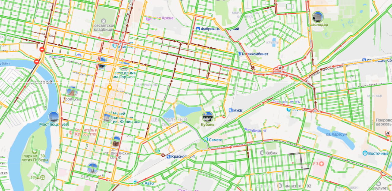По данным на 18:30, водители встали в пробках в центре города — на улицах Митрофана Седина, Суворова, Базовской, Кубанской Набережной, Октябрьской, Калинина, Северной, Красной и других.