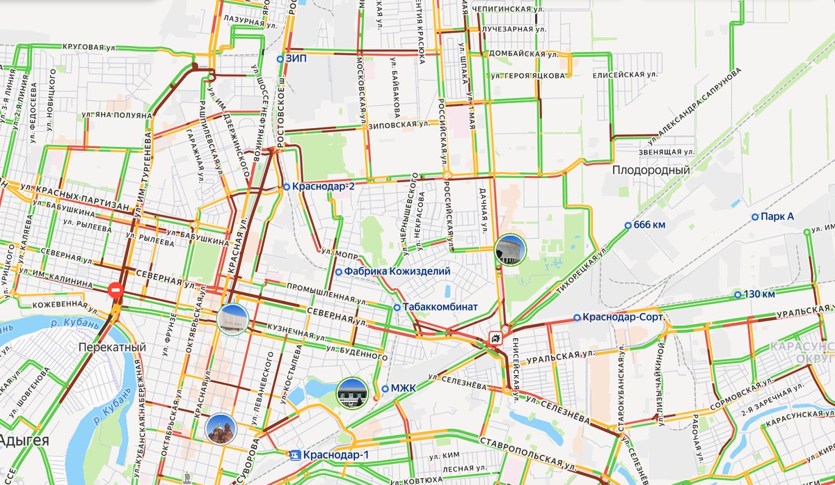 По данным на 17:30, в пробках увяз центр Краснодара — улицы Красная, Рашпилевская, Хакурате, Гаврилова, Кубанская Набережная.