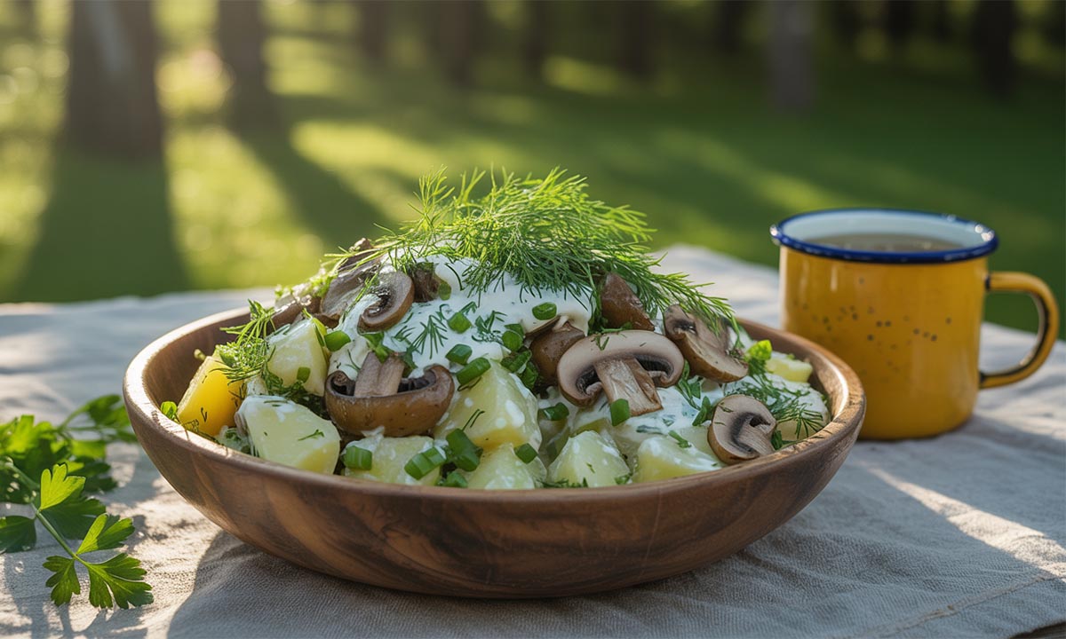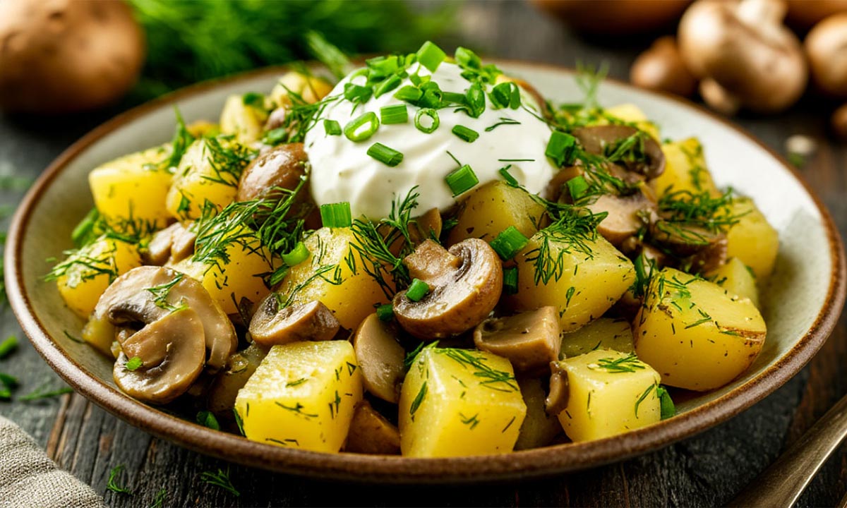 Простой и вкусный рецепт теплого салата с картошкой и грибами