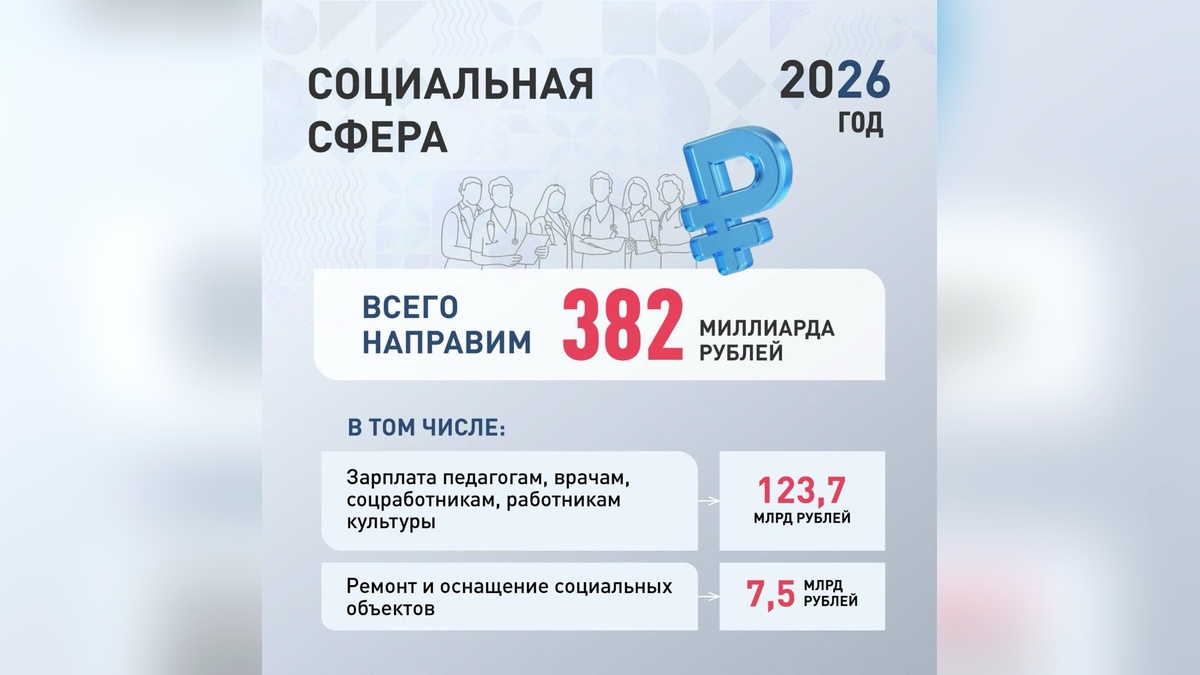 Всего на повышение заработной платы работникам соцсферы в соответствии с указами Президента России дополнительно направят порядка 16 млрд рублей. Всего же на заработную плату работников бюджетной сферы в 2026 году предусмотрели 123,7 млрд рублей.
