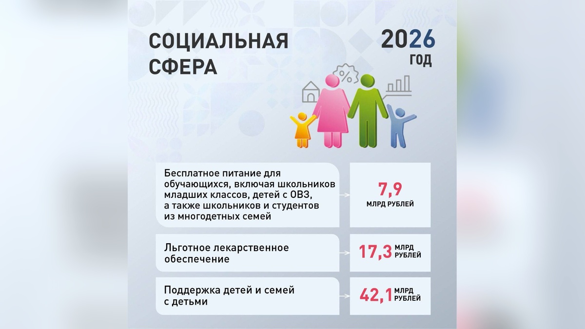 Вениамин Кондратьев отметил, что еще 7,9 млрд рублей выделят на бесплатное питание обучающихся — это на 1 млрд больше, чем в 2025-м. На ремонт и оснащение учреждений образования, здравоохранения, культуры и спорта на будущий год предусмотрели 7,5 млрд рублей. На льготное лекарственное обеспечение — 17,3 млрд.