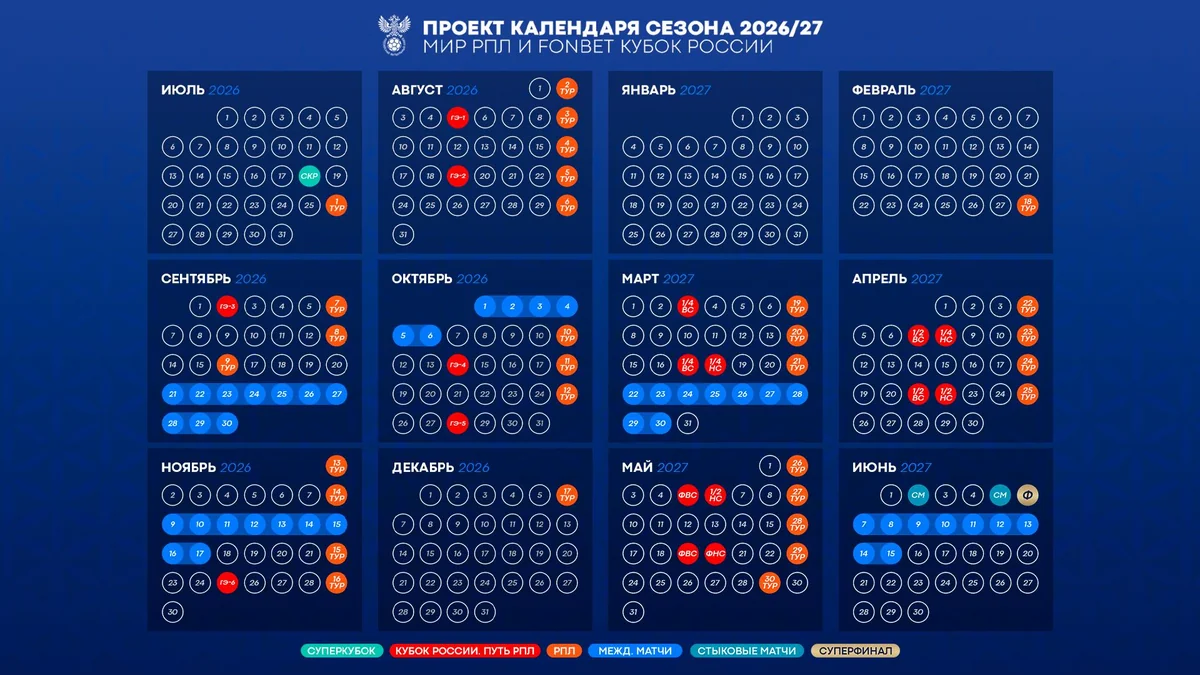 Первой игрой сезона 2026/27 станет матч за Суперкубок России 18 июля. Групповой этап Пути РПЛ Кубка России стартует 5 августа и продлится до 25 ноября. Календарь первого этапа турнира будет утвержден позднее. Трофей разыграют 6 июня 2027 года.