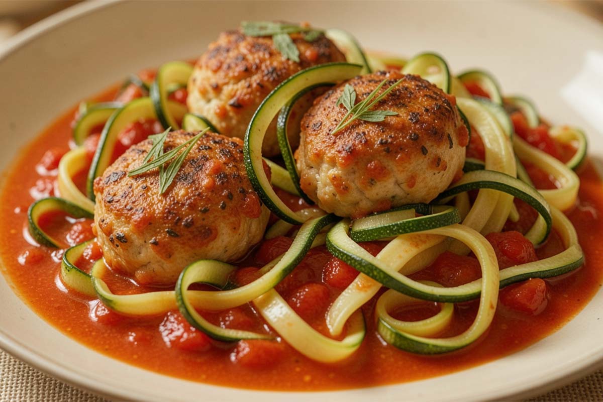 Куриные фрикадельки в томатном соусе с цукини-лапшой