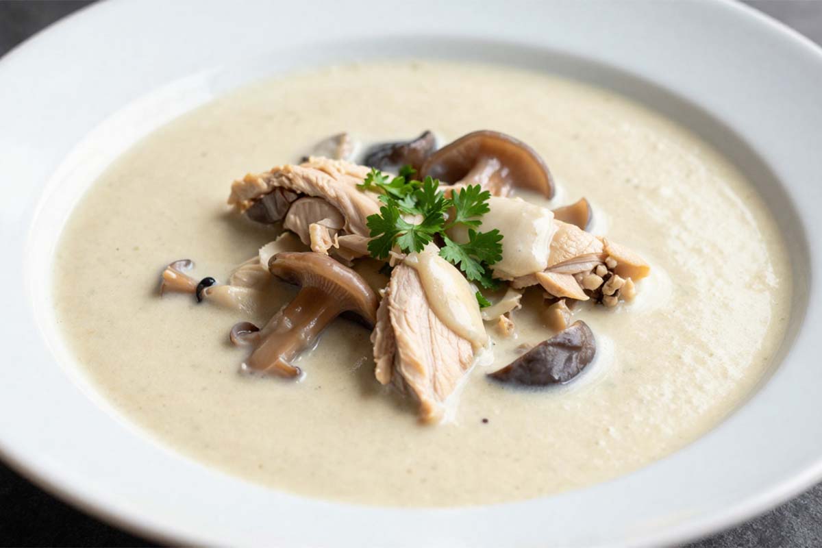 Мы тушим их все вместе. Добавляем нежирный бульон. Взбиваем блендером.