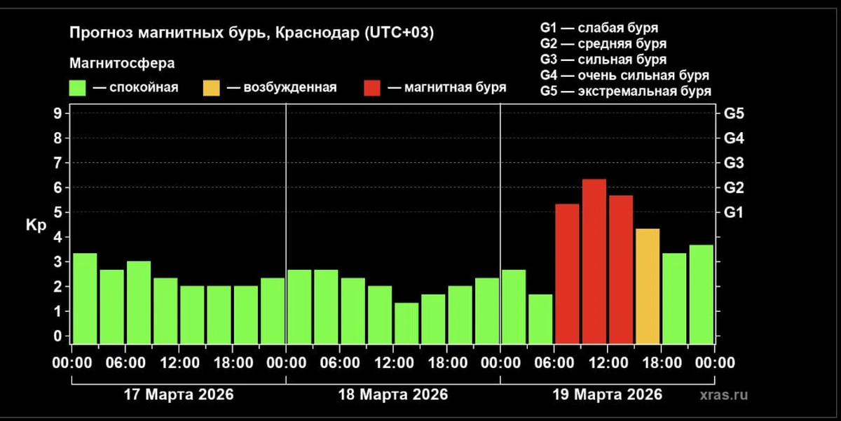 Расчетная сила бури в пике — от G2 до G3, это считается сильной магнитной бурей. Вероятность того, что магнитная буря достигнет уровня G4 составляет всего лишь 1-3 %.