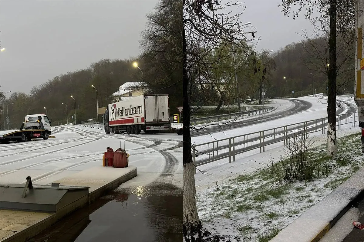 На фото из Лазаревского района создается впечатление, что на курорте в апреле прошел снегопад. Очевидцы сообщали, что слой льда на дорогах вызвал небольшие затруднения при движении транспорта.