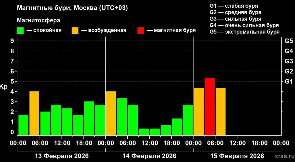 Вторая магнитная буря февраля пока находится в диапазоне от слабой до средней.