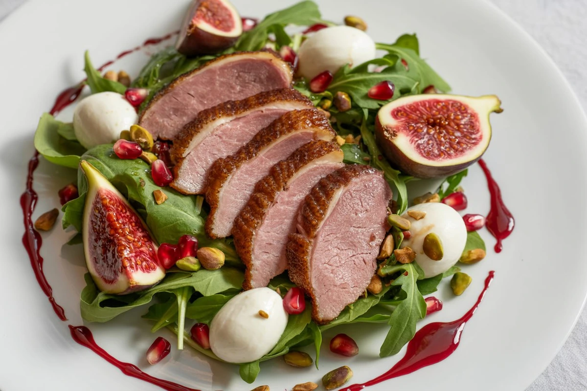 Итак, все ингредиенты у нас готовы. Остается собрать салат. На блюдо выкладываем рукколу. Утку, нарезаем тонкими ломтиками, инжир — дольками и раскладываем все это сверху. Сбрызгиваем оливковым маслом. Поливаем гранатовым соусом. Если нужно — присаливаем. Посыпаем перцем и дроблеными фисташками. Прошу всех к столу!