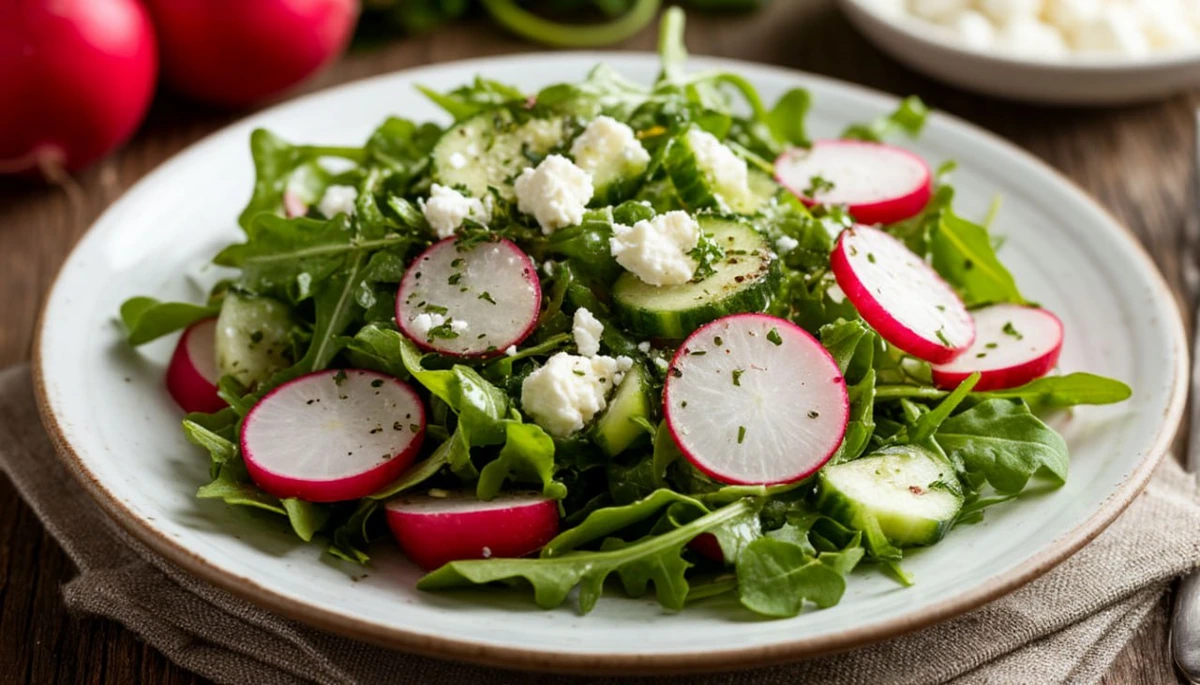 Это не просто салат. Это сама свежесть выложенная на тарелки. Хрустящий редис, первые огурцы и нежная зелень — лучшие друзья здорового аппетита и украшение стола.