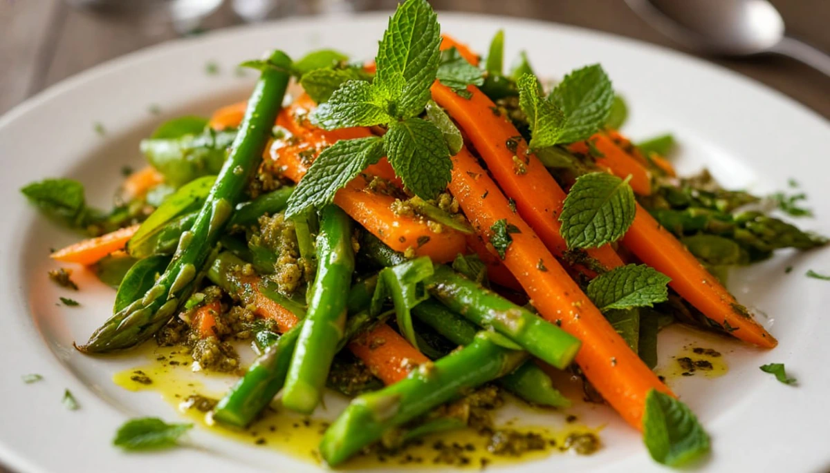 Обжариваем спаржу и морковь на сковороде с 1 ст.л. оливкового масла. Достаточно 5-7 минут для достижения мягкости и легкой корочки.