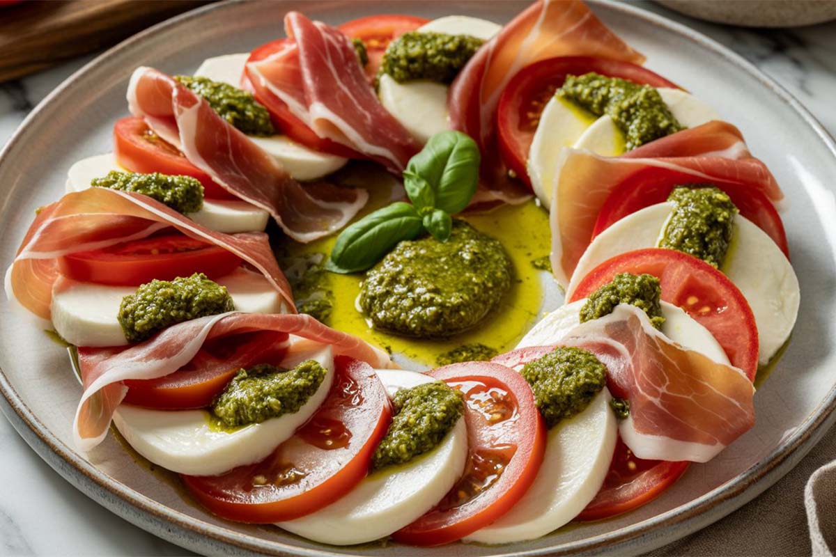 Подаем сразу — пока моцарелла холодная и упругая. Лучше всего с хрустящей чиабаттой или гренками, бокалом лимонада или холодного белого сухого вина.