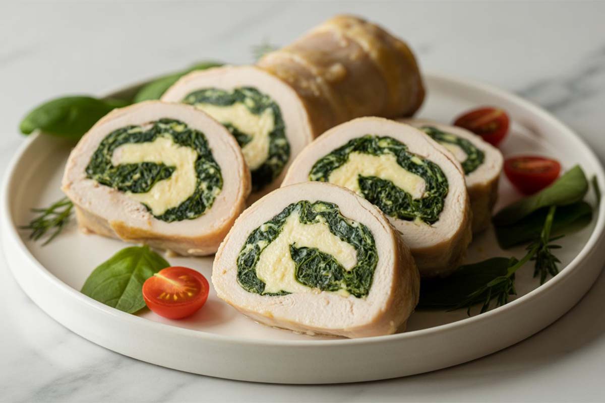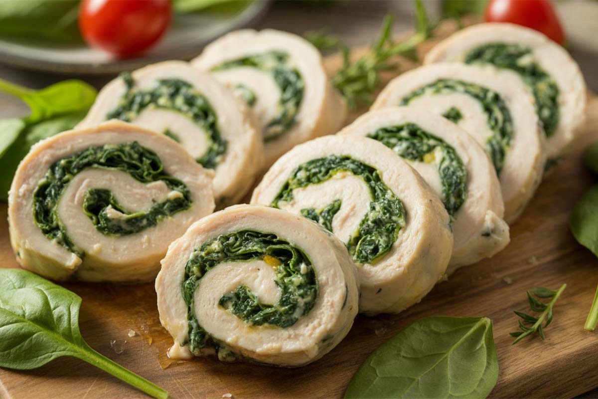 Запекаем накануне вечером куриную грудку, отбитую в тонкий пласт, с начинкой из сливочного сыра, шпината и вяленых томатов. После остывания убираем ее в холодильник. На обед нарезаем аккуратными ломтиками.