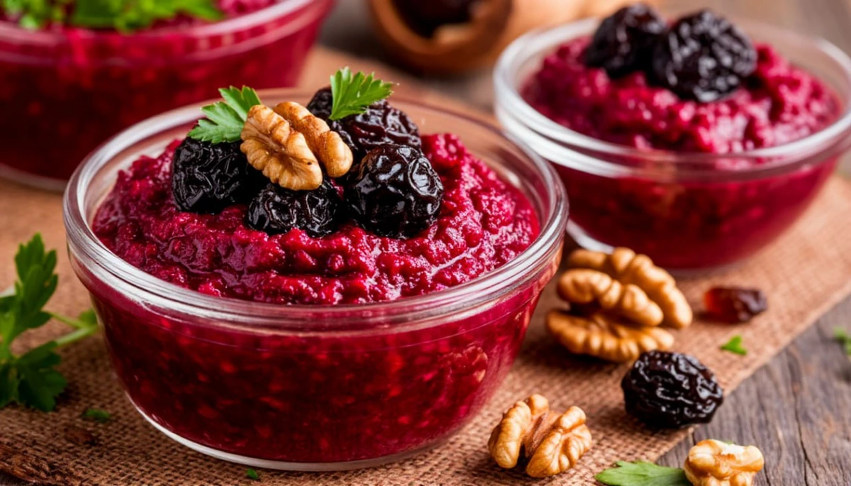 В глубокой емкости — миске, кастрюльке или салатнице — соединяем свеклу, обжаренный лук, чернослив, орехи и чеснок, выдавленный через пресс.