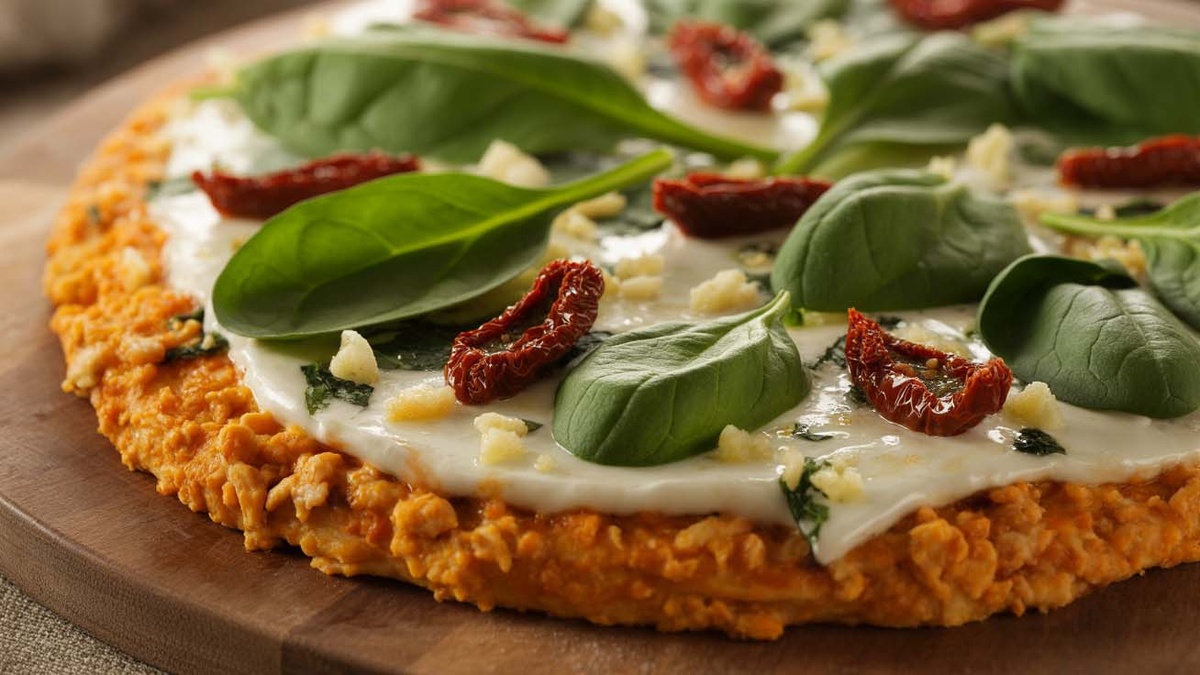 Шпинат слегка припускаем на сковороде и отжимаем лишнюю жидкость. Равномерно распределяем его по поверхности основы, сверху выкладываем вяленые томаты и оливки. Посыпаем тертой моцареллой и приступаем к финальному выпеканию: возвращаем пиццу в духовку на 5-7 минут, чтобы сыр расплавился.