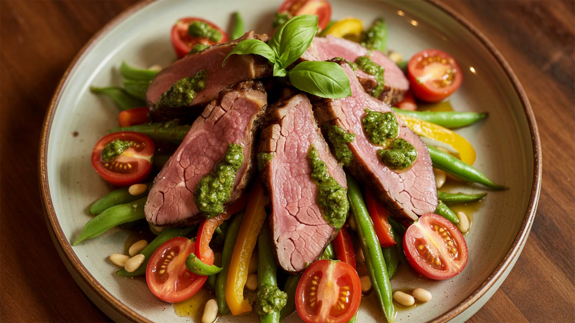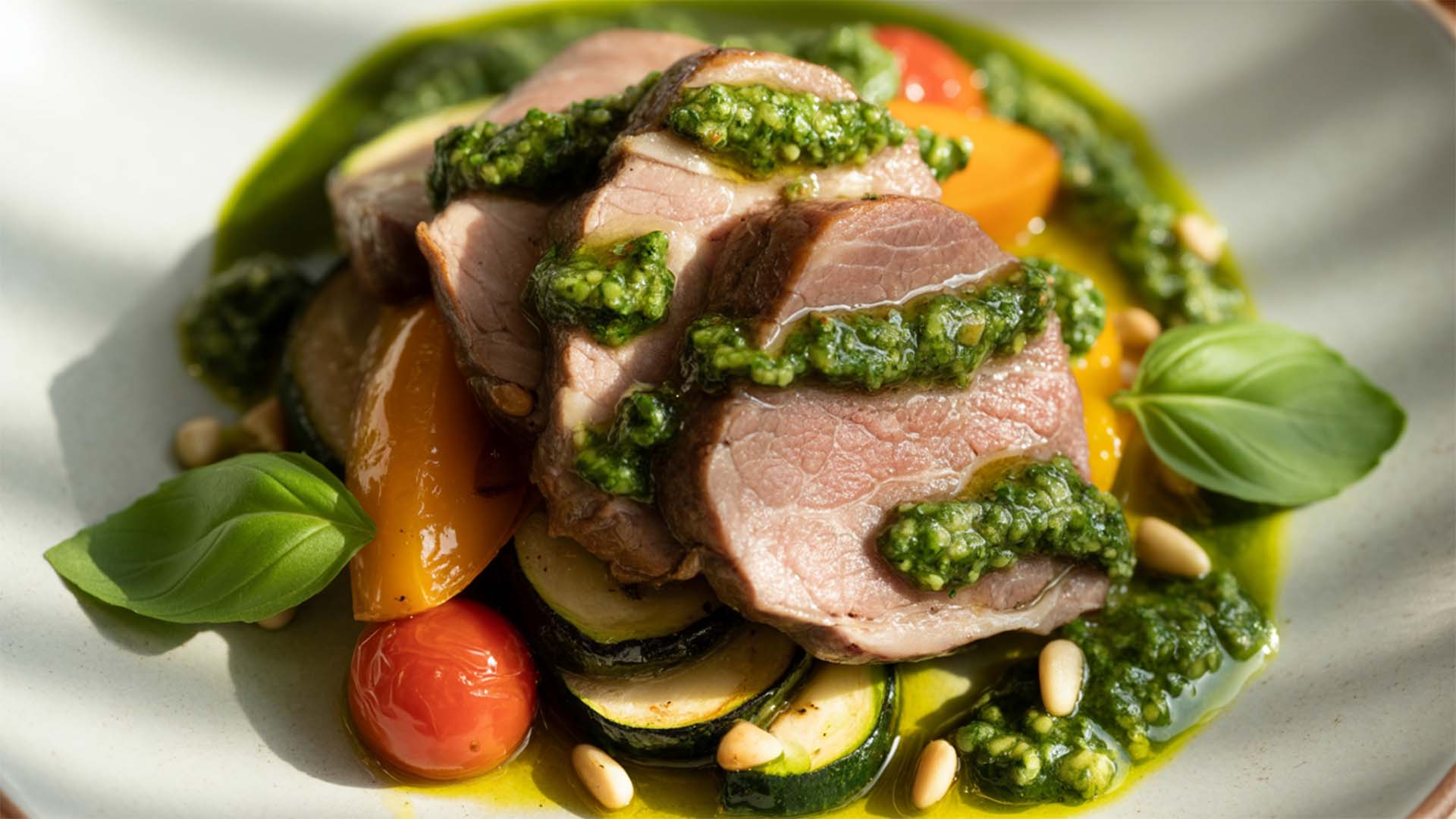 В большой миске или салатнице смешиваем теплые овощи, ломтики языка и рукколу. Заправляем соусом песто. Аккуратно перемешиваем.
