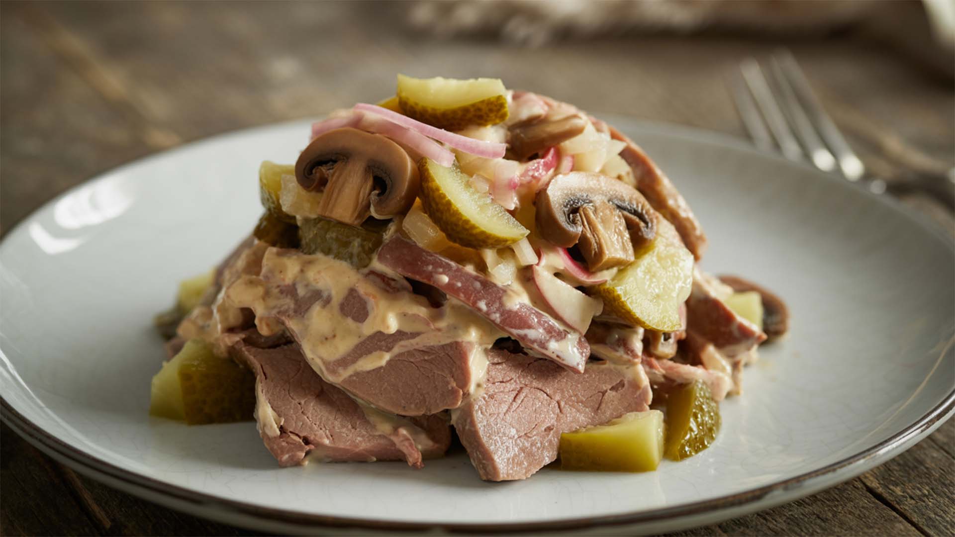 Идеального сочетания нежности языка, хрустящих соленые огурчиков и ароматных грибочков — классика неподвластная времени. Будет, как всегда, вкусно, изыскано, просто, но шикарно.