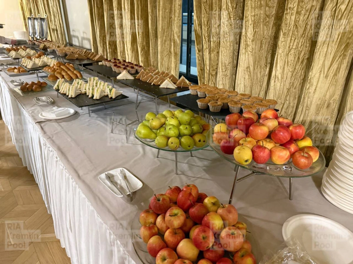 Однако голодными журналистов не оставили, для них организовали столы с перекусом. На них были сырники, блины, фрукты, кексы, булочки, бутерброды, напитки.