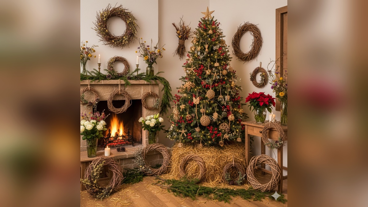 Из интерьера рекомендуется убрать все «холодное и неживое». Нет, шкафы и диваны выносить не обязательно. Просто, по возможности, минимизируйте серые и холодные голубые оттенки, замените металлические элементы декора на деревянные или глиняные, добавьте природных материалов. Солому тоже можно, даже нужно. А еще можно еловые лапы (особенно, если «основная» елка искусственная), шишки, венки из веток, живые цветы (если у вас как раз расцвела пуансеттия — зовите и ее на праздник).